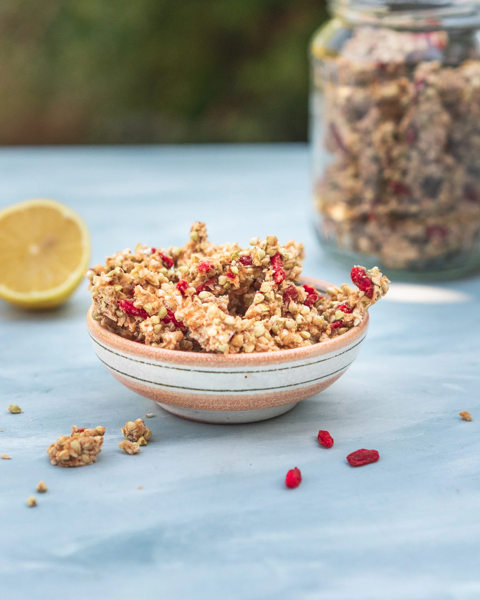 The process is super simple and only a few ingredients are required. First we make a kind of sweet, tangy, lemony paste, then we stir in the buckwheat and gojis and finally we dehydrate the mixture until it becomes perfectly crisp,