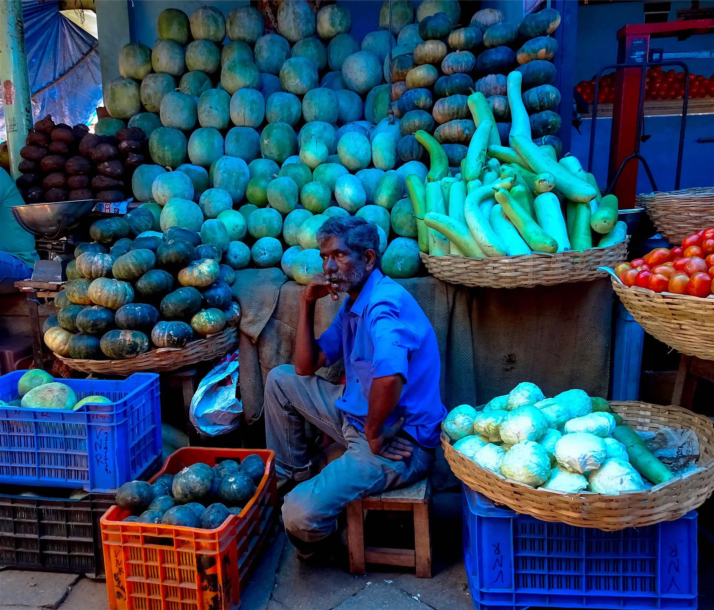 What blows my mind about this market and a lot of india is that there always seem to be multiple outlets selling exactly the same thing and they're always right next to each other. This market was a perfect example of this. Rows and rows of bananas, then coconuts, then onions, greens, flowers, etc. I guess the locals have their preferred sellers but I really can' get my head around the system. Maybe it’s to do with the sheer volume of people and produce in the country and expense of the real estate to trade in? Anyway, as I said, the market offers some great photo opportunities.
